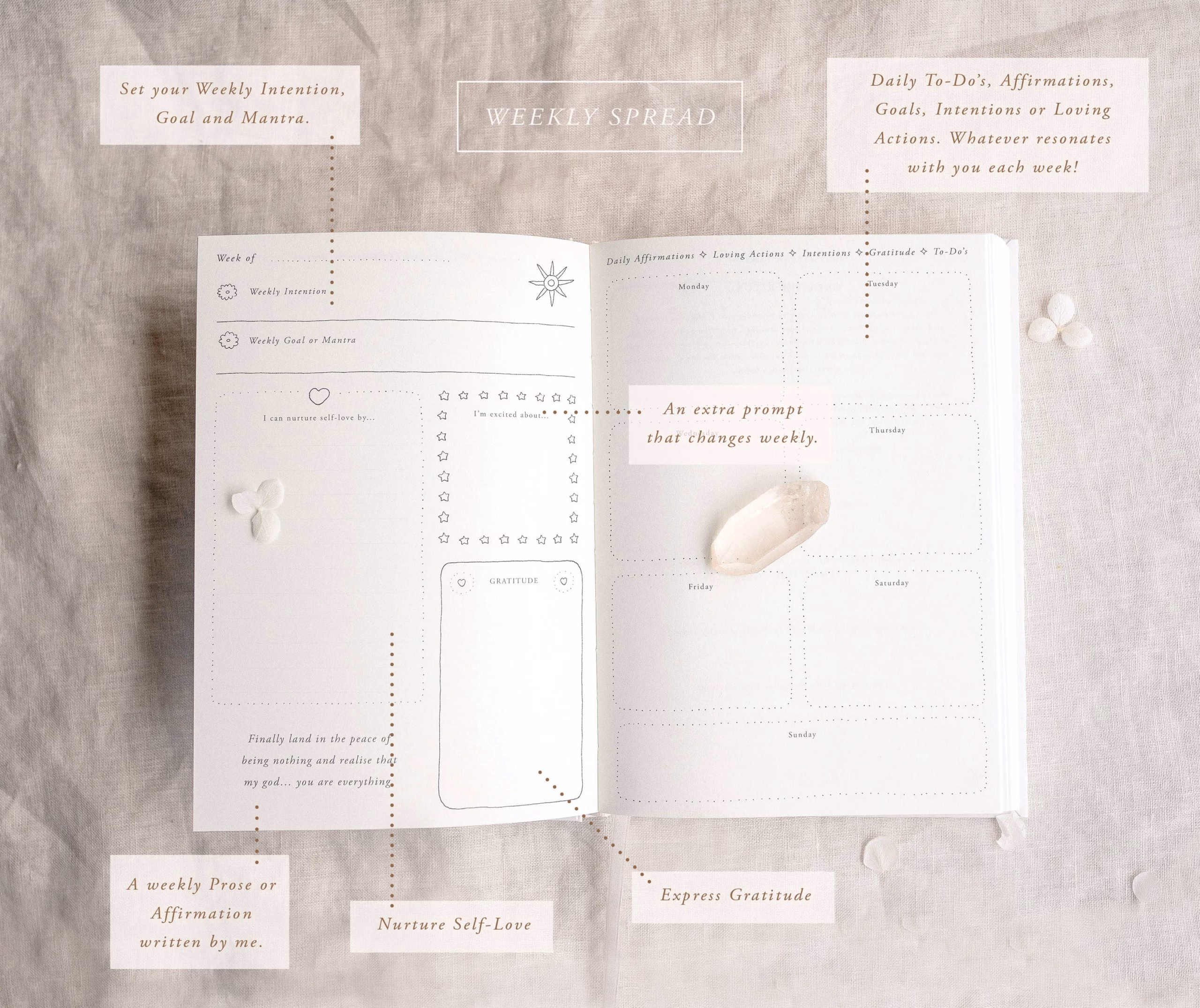 ☆ Weekly Spreads to set meaningful intentions, practice gratitude and prioritise self-love.